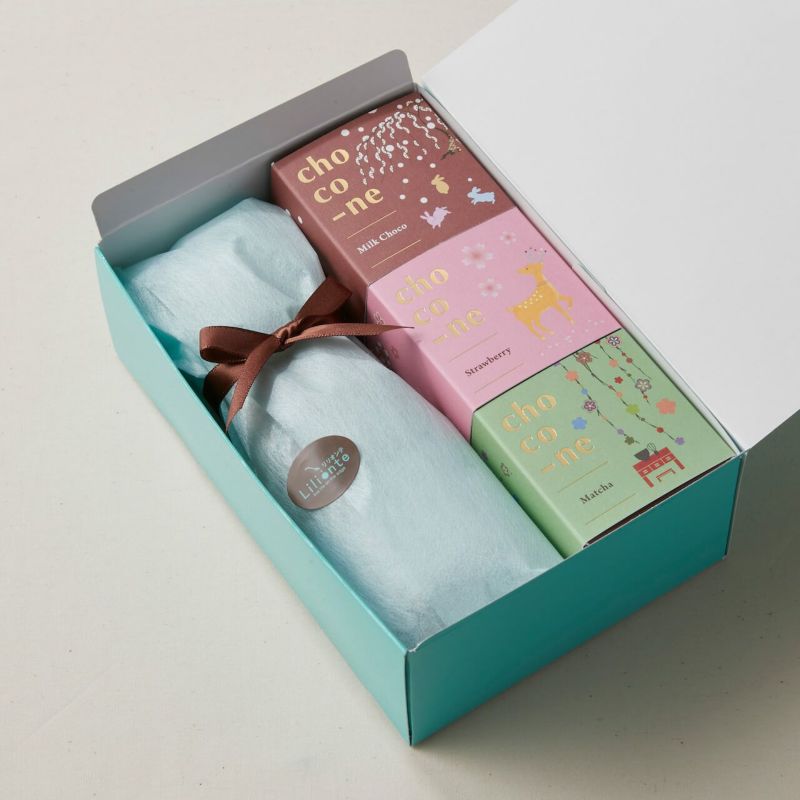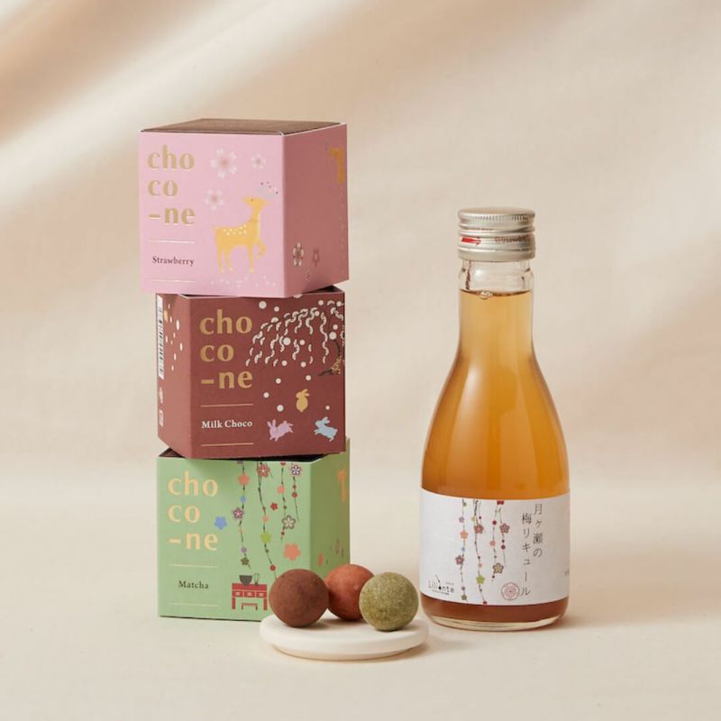 ●お酒とセットになっているショコネ3箱: いちご(あすかルビー)、ミルクチョコ、大和抹茶