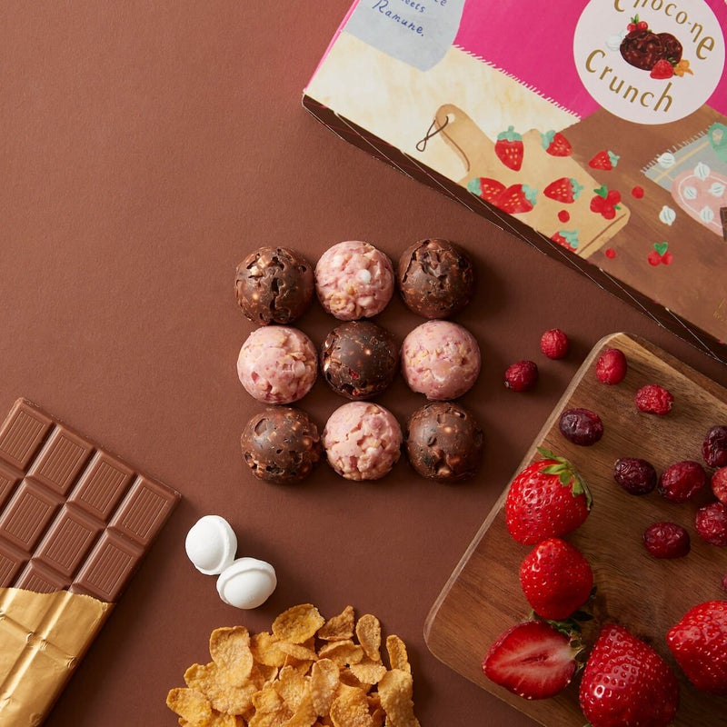 濃厚なチョコレートに、小粒のラムネやサクサクフレーク、そして奈良県産いちご(あすかルビー)やクランベリーなどの果実の甘酸っぱさをギュッと詰め込みました。クランチならではのサクサク感と、それぞれの素材が織りなす美味しさをご堪能ください。