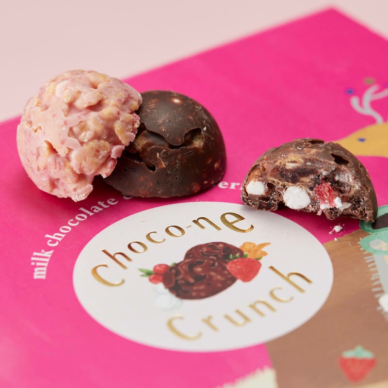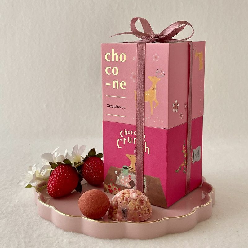 濃厚なチョコレートに、小粒のラムネやサクサクフレーク、そして奈良県産いちご(あすかルビー)を詰め込みました。クランチならではのサクサク感と、それぞれの素材が織りなす美味しさをご堪能ください。