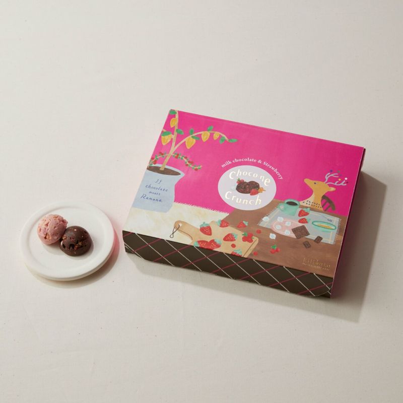 濃厚なチョコレートに、小粒のラムネやサクサクフレーク、そして奈良県産いちご(あすかルビー)やクランベリーなどの果実の甘酸っぱさをギュッと詰め込みました。クランチならではのサクサク感と、それぞれの素材が織りなす美味しさをご堪能ください。